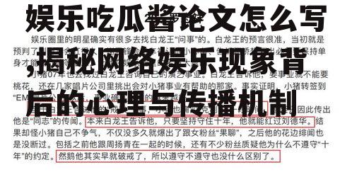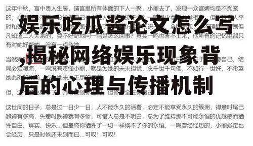 写一篇关于娱乐吃瓜酱的论文,需要你具备敏锐的观察力、扎实的理论基础和严谨的写作态度。相信只要你按照以上步骤,一定能够写出一篇优秀的论文。加油哦!