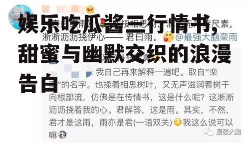 你知道吗?最近娱乐圈可是热闹非凡,各种八卦新闻层出不穷,让人看得是津津有味。这不,我就发现了一款特别有趣的APP,叫做“娱乐吃瓜酱”,简直就是吃瓜群众的福音啊!而且,听说还有人用这个APP写出了三行情书,简直太有创意了!下面,就让我带你一起探索这个神奇的APP,看看那些让人捧腹大笑的三行情书吧!