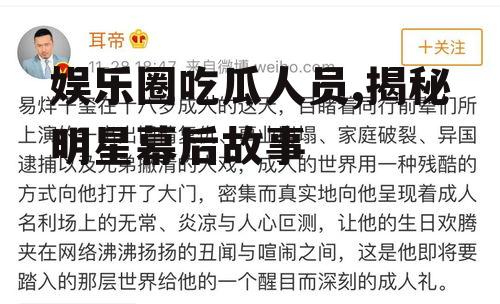 娱乐圈,这个光鲜亮丽的舞台,总是充满了各种八卦和传闻。而在这个舞台上,有一群特殊的观众,他们就是热衷于“吃瓜”的娱乐圈吃瓜人员。他们如同侦探一般,时刻关注着明星们的动态,从他们的言行举止中寻找线索,揭开娱乐圈的神秘面纱。今天,就让我们一起走进这个充满趣味的世界,看看娱乐圈吃瓜人员的那些事儿。